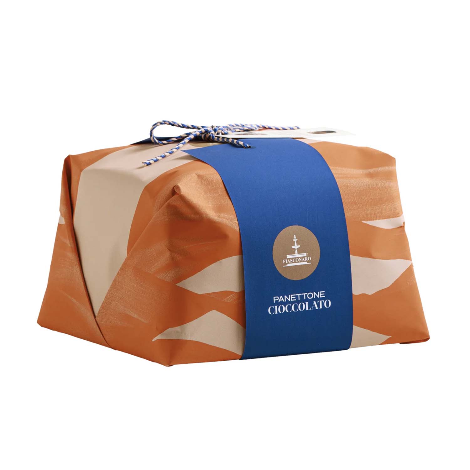 Panettone met chocoladedruppels bedekt met suikerkorrels, met de hand verpakt.